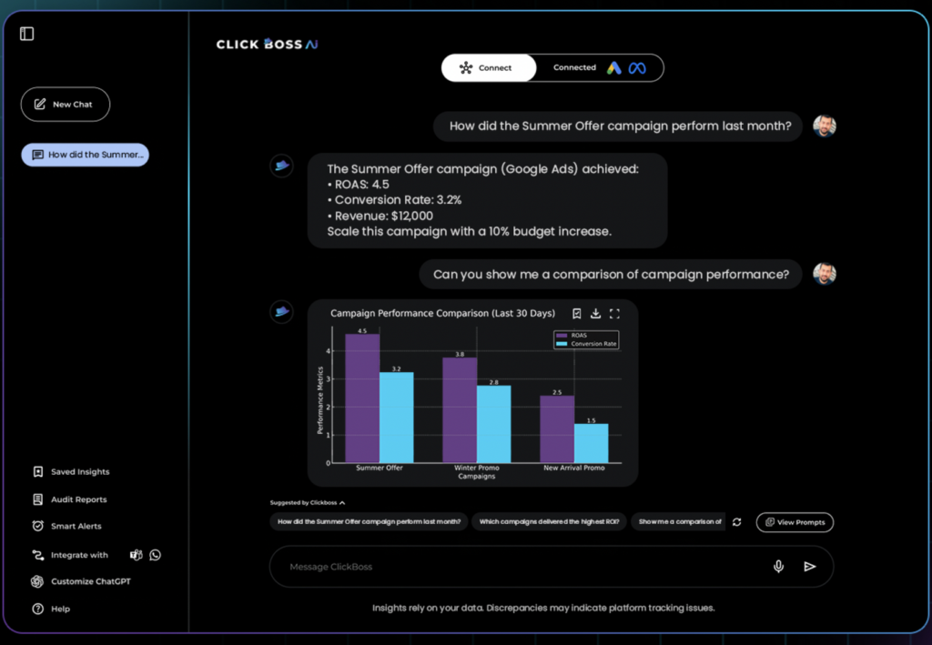 يُبسّط ClickBoss AI أرقامك لك. لا مزيد من بحر جداول البيانات والانتظار الطويل للتقارير. يحوّل ClickBoss AI الأرقام المختلطة إلى بيانات بسيطة وقابلة للتنفيذ في الوقت الفعلي، حتى تتمكن من تتبع الأداء، واكتشاف الفرص، والبقاء في الطليعة. إنه مخصص للشركات الصغيرة، والشركات الناشئة سريعة النمو، أو الشركات الناشئة. ستحصل على وصول إلى تحليلات قوية دون الحاجة إلى جيش من متخصصي البيانات.